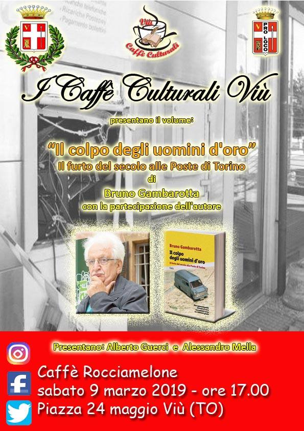 Una bella sorpresa per i viucesi: l’arrivo del noto scrittore, giornalista, conduttore e umorista piemontese Bruno Gambarotta in occasione dei Caffè Culturali che, da qualche anno, regalano qualche pomeriggio di svago e cultura a tutti e tutte. Sabato 9 marzo, alle ore 17.00 presso il Caffè Rocciamelone di piazza XXIV maggio, verrà presentato, infatti, l’ultimo libro del brillante e celebre scrittore astigiano. “Il colpo degli uomini d'oro. Il furto del secolo alle Poste di Torino” è un libro dalla trama accattivante: “_Giovedì 27 giugno 1996, ore 8 del mattino: alla direzione delle Poste di Torino i funzionari dell'Ufficio Cassa aprono i sacchi raccolti il giorno prima dalle varie sedi postali. Sono pieni fino all'orlo, è in scadenza il pagamento dell'ICI. Dentro però, invece del denaro, trovano fumetti di Topolino e pagine di libri scolastici tagliuzzati della misura delle banconote da 100 e 50.000 lire. Nel giro di recupero che fa il furgoncino blindato, preceduto e seguito da due auto di scorta, è successo qualcosa, anche se tutto sembrava andare liscio e nessuno si è accorto di niente. Quattro insospettabili – o forse di più? - e la 'ndrangheta, le fughe in Albania e Costarica e due cadaveri nascosti in un noccioleto della Val Susa, pistole del secolo scorso ancora fumanti, playboy di provincia e mogli gelose... Bruno Gambarotta ricostruisce la cronaca dettagliata del colpo sabaudo del secolo, una storia realmente accaduta che per molti mesi ha tenuto col fiato sospeso l'Italia. E lo fa lavorando sugli articoli della “Stampa”, intervistando avvocati e pubblici ministeri, studiando le carte del processo. Una appassionante vicenda di nera raccontata come un romanzo giallo, dove le cose non sono mai quelle che sembrano_”. Accompagneranno l’autore, con domande e curiosità, l’assessore Alberto Guerci e lo scrittore e divulgatore Alessandro Mella. L’evento si svolge con il concorso dell’amministrazione comunale e della Pro Loco. Locandina di Massimo Mella.
