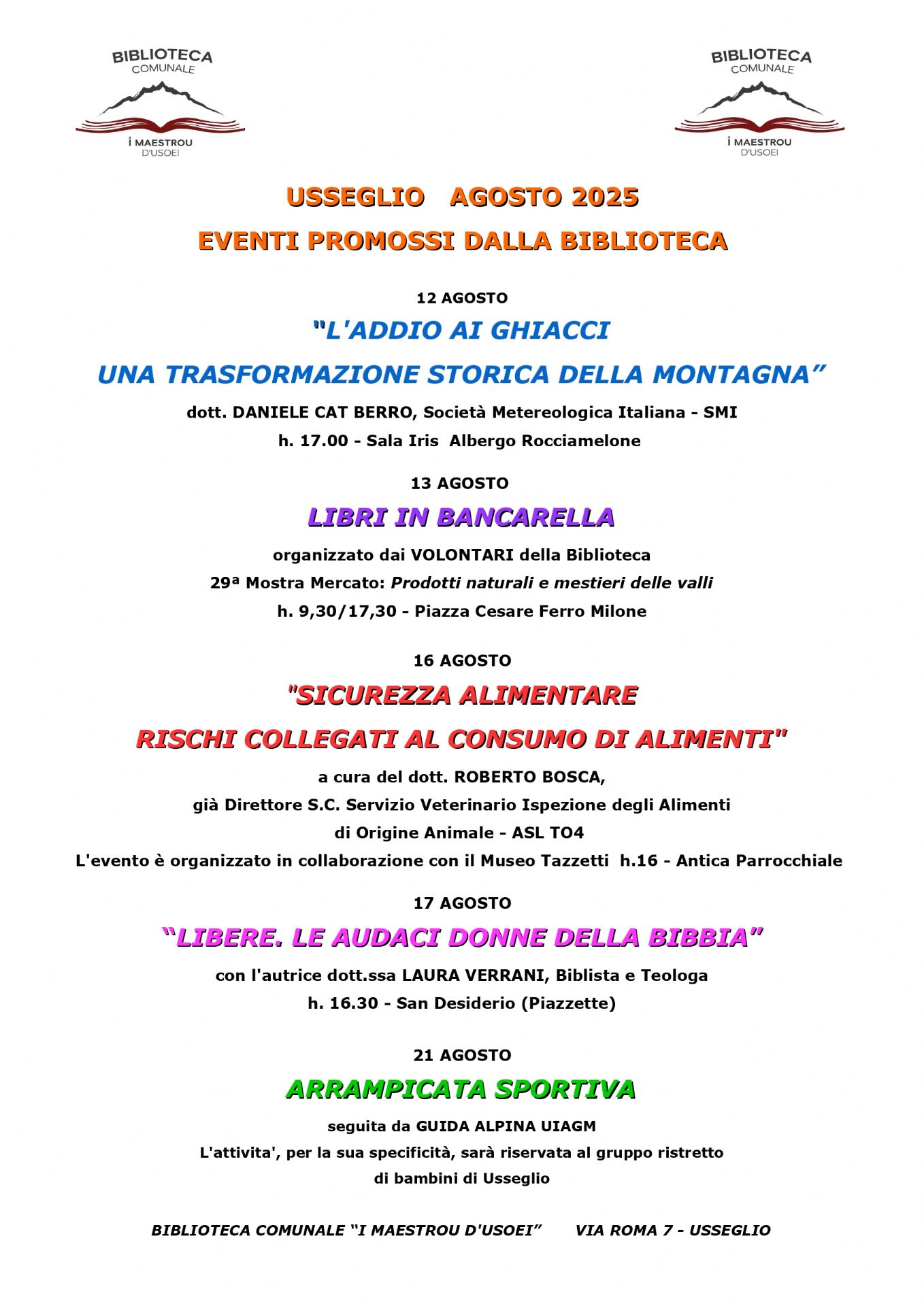 La Biblioteca Comunale "I Maestrou D'Usoei" di Usseglio ha in programma una serie di eventi culturali e educativi nel mese di agosto 2025. Queste iniziative offrono l'opportunità di scoprire vari aspetti della storia, della cultura locale e delle tradizioni montane, con attività adatte a tutte le età.