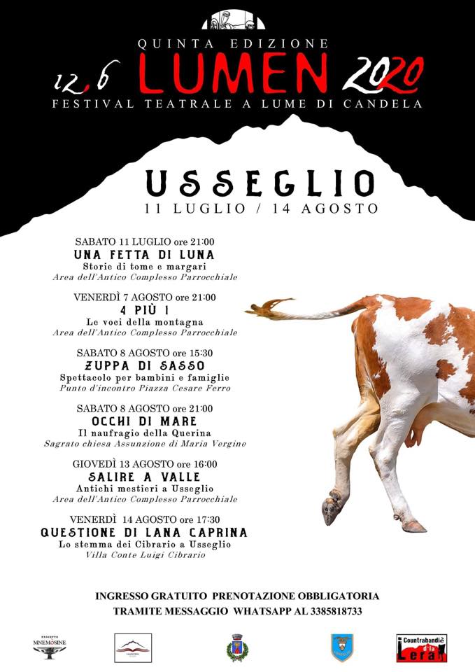 Nell’ambito del Festival Teatrale al lume di candela “12,6 Lumen” sabato 11 luglio 2020 ore 21 presso l’area dell’Antico Complesso Parrocchiale di Usseglio si terrà lo spettacolo UNA FETTA DI LUNA - storie di tome e margari