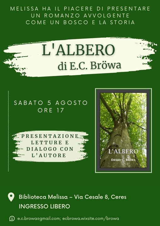 La biblioteca Melissa ha il piacere di presentare un romanzo avvolgente come un bosco:"L'albero". Vi aspettano il 5 agosto per la presentazione, la lettura e un dialogo con l'autore, Eward C. Browa.