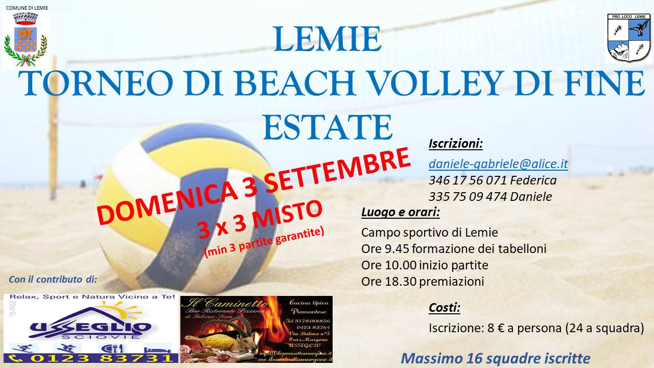 Domenica 3 settembre 2017 presso il campo da beach volley di Lemie verrà effettuato un grande torneo di fine estate!