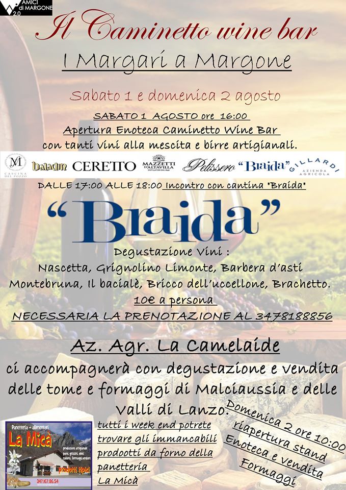 Terzo week end di questa rassegna, vi aspettiamo in compagnia di BRAIDA per una fantastica degustazione dei suoi vini. Ad accompagnarci ci sarà Az. Agr. La Camelaide (MALCIAUSSIA) con le Tome ed i formaggi delle nostre valli…. non mancate..