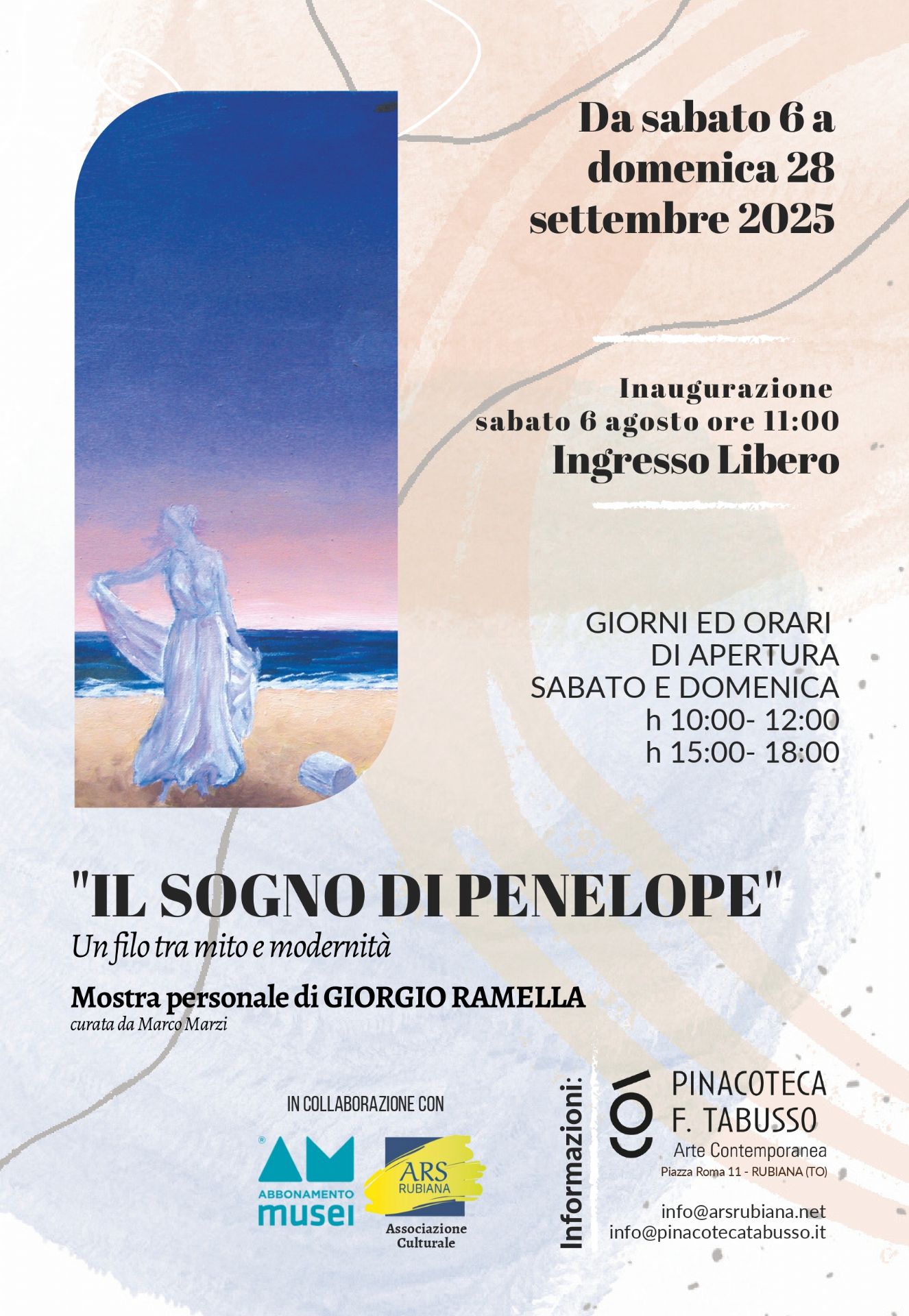 Dal 6 al 28 settembre 2025, la Pinacoteca F. Tabusso di Rubiana (TO) ospita la mostra d’arte “Il Sogno di Penelope”, una raffinata esposizione che propone una rilettura contemporanea del mito di Penelope attraverso le opere dell’artista Giorgio Ramella. La mostra, curata da Marco Marzi, offre un percorso visivo che unisce suggestioni classiche e sensibilità moderne, in un dialogo poetico tra passato e presente.