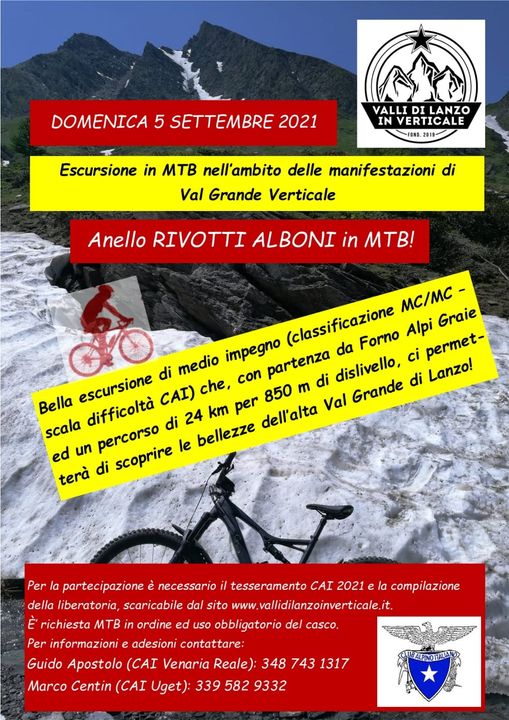 Ritrovo: ore 9:00 presso piazzale dietro Albergo Savoia di Forno Alpi Graie. Escursione aperta anche a e-bike. Casco obbligatorio, bici in ordine e adeguata alla difficoltà prevista.