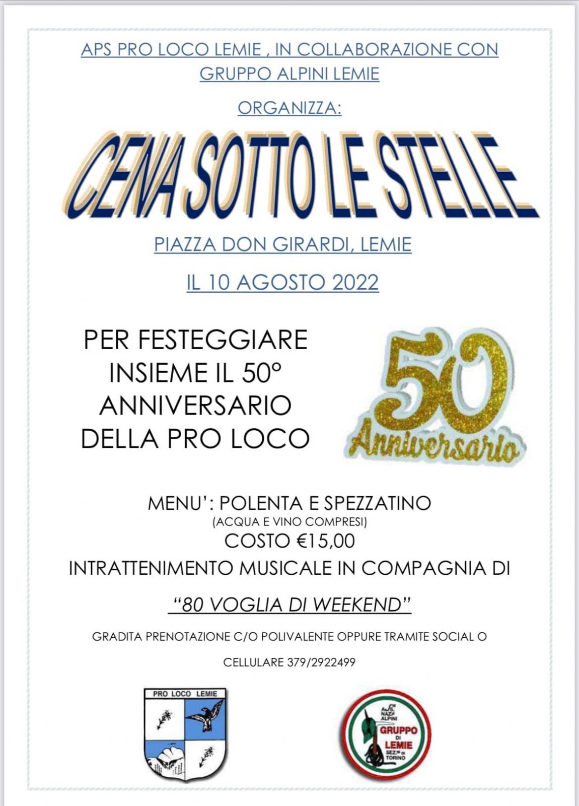 Per festeggiare insieme i 50 anni di attività, la Proloco di Lemie insieme all'aiuto degli Alpini organizza una cena sotto le stelle. menù a base di polenta e spezzatino (acqua e vino compresi) al costo di 15 euro.