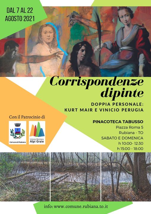 Proseguono gli appuntamenti artistici estivi presso la Pinacoteca comunale Francesco Tabusso di Rubiana. Sabato 7 agosto alle ore 10.30 verrà inaugurata l'esposizione pittorica "CORRISPONDENZE DIPINTE", la doppia personale incentrata sui Maestri KURT MAIR e VINICIO PERUGIA.