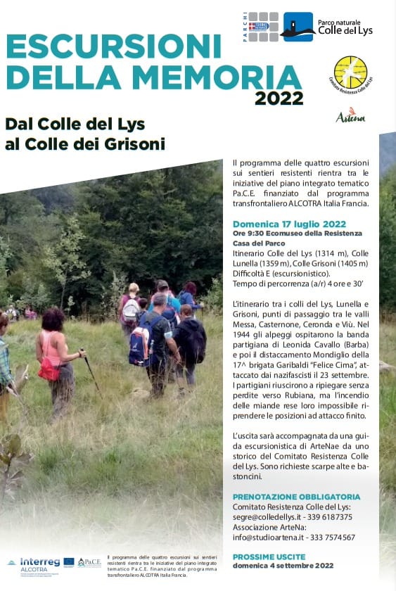 Itinenario: Colle del Lys (1314m), Colle Lunella (1359), Colle Grisoni (1405), punti di passaggio tra le valli Messa, Casternone, Ceronda e viù. Qui nel 1944 era insediata la banda partigiana Leonida Cavallo e il distaccamento mondiglio della 17° Brigata Garibaldi "Felice Cima". La visita sarà accompagnata da una guida escursionistica di ArteNae e da uno storico del Comitato Resistenza Colle del Lys.