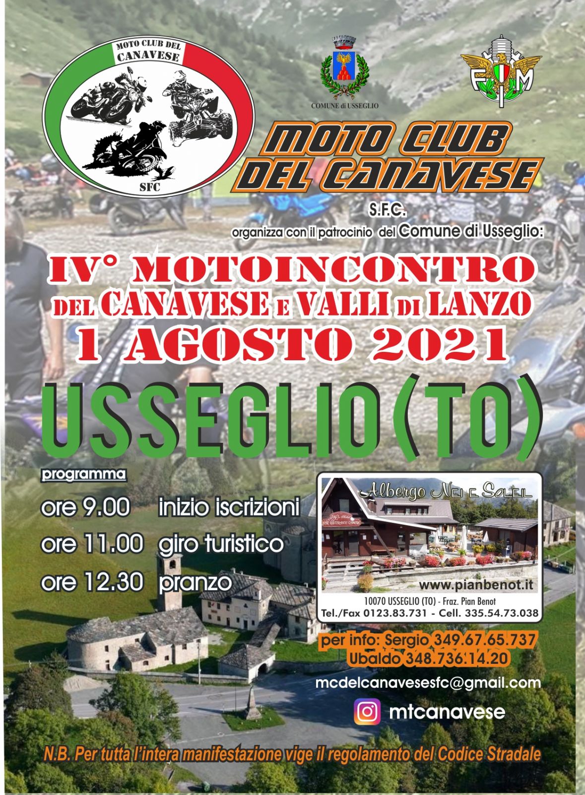 Il primo agosto 2021 il Motoclub del Canavese S.F.C. torna a fare mototurismo e vi invita nel Comune di Usseglio. Saremo ospiti della ridente località di Pian Benot, comprensorio sciistico d'inverno e paradiso per ciclisti, appassionati di trekking e motociclisti d'estate.