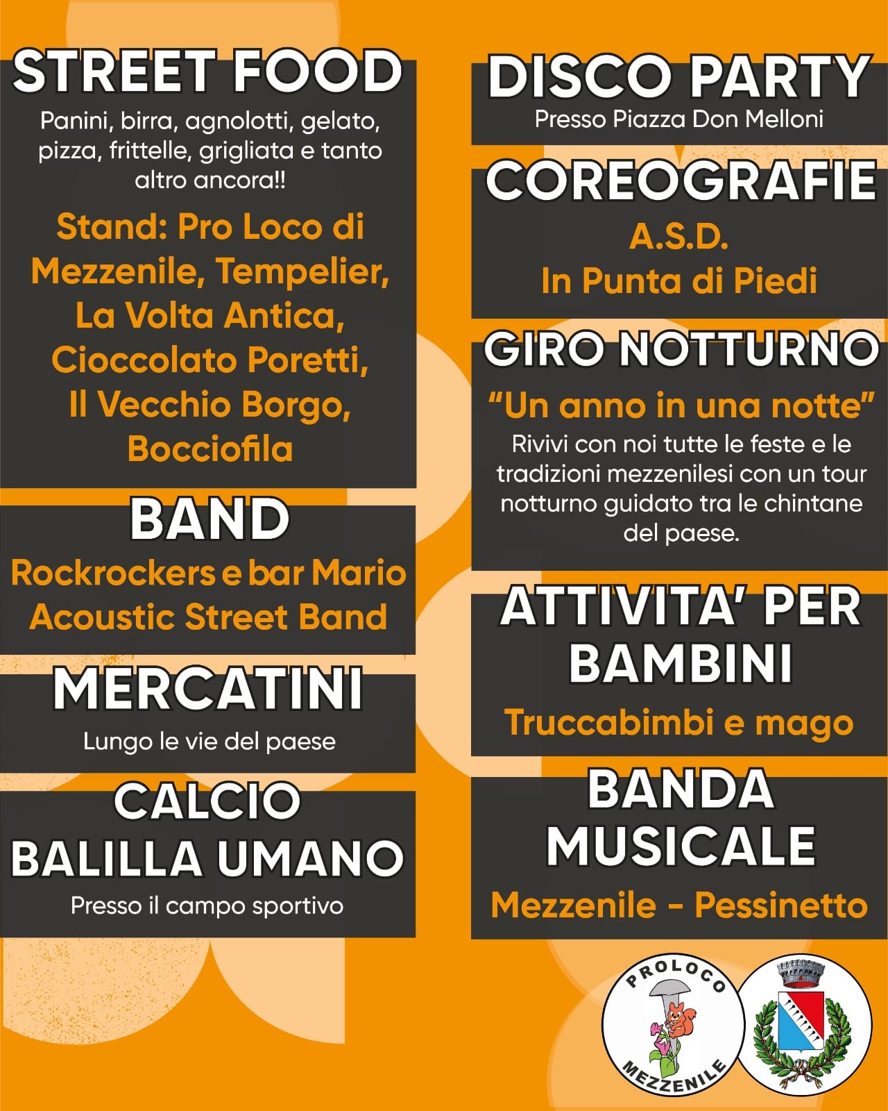 A grande richiesta il 16 luglio torna la Notte Nera con mercatini per le vie del paese, street food, esibizioni musicali, attività per bambini, calciobalilla umano, percorsi guidati