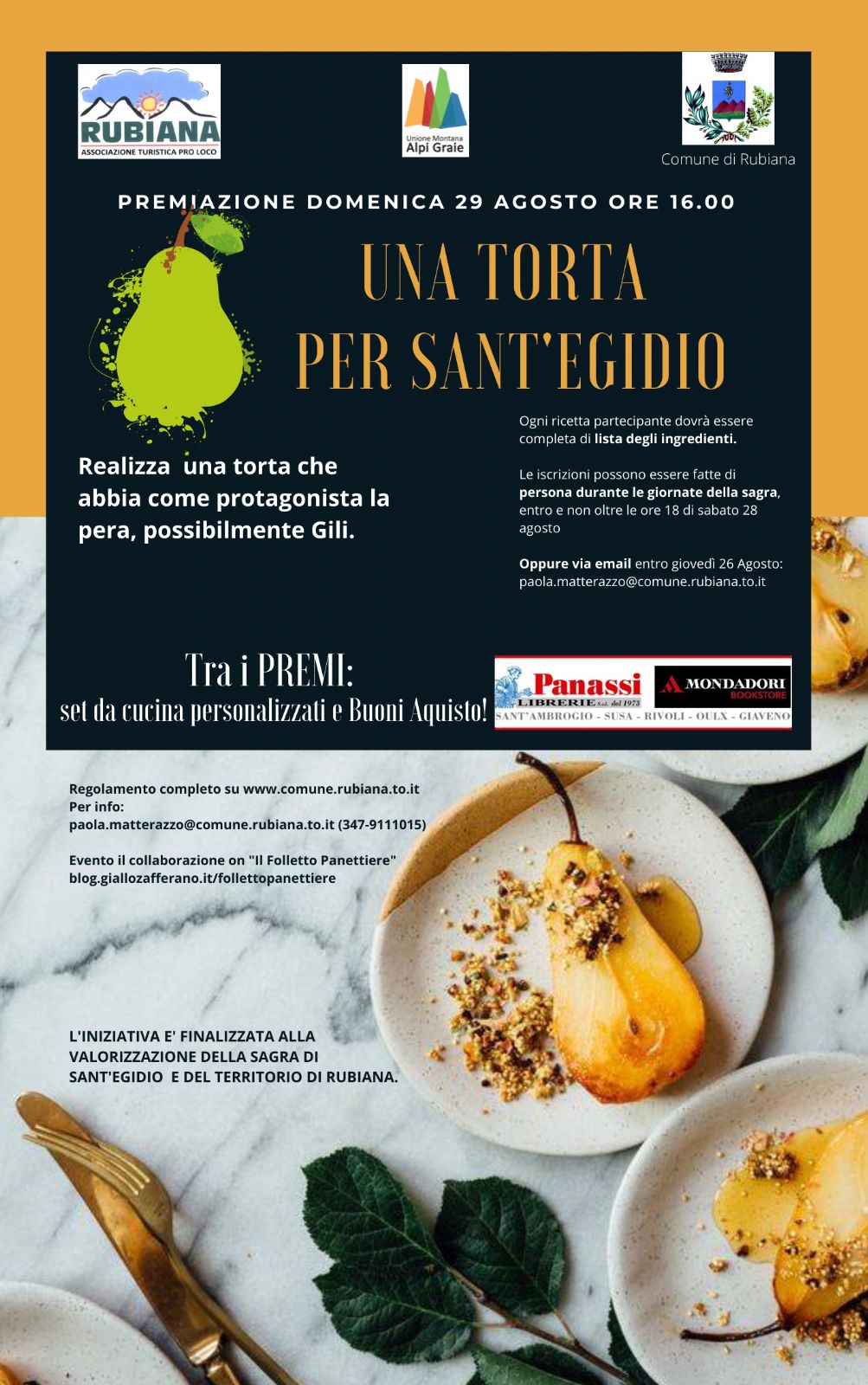 Le iscrizioni posso essere effettuare di persona durante le giornate sella sagra, entro e non oltre le ore 18:00 di sabato 28 Agosto, oppure via email entro giovedì 26 Agosto: paola.materazzo@comune.rubiana.to.it