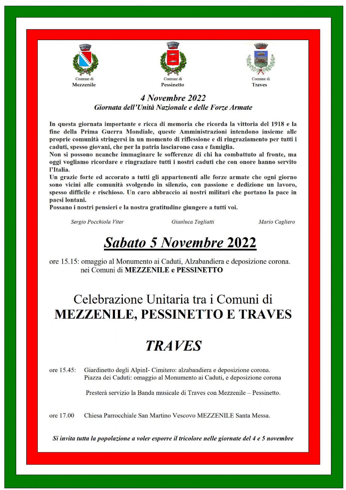 4 Novembre 2022 - Giornata dell’Unità Nazionale e delle Forze Armate - Celebrazione unitaria tra i Comuni di Mezzenile, Pessinetto e Traves