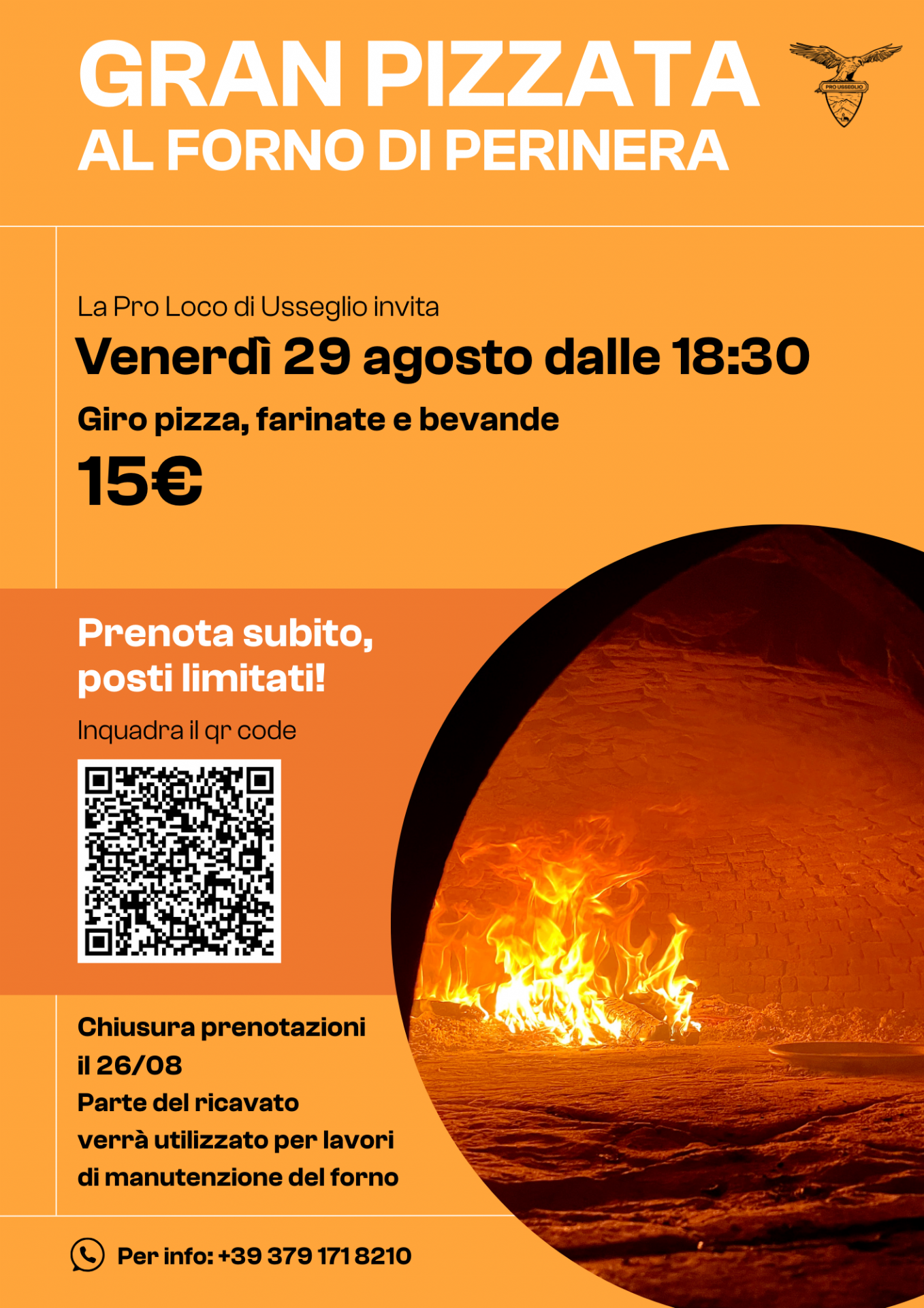 L'evento prevede l'accensione del forno e la somministrazione di pizze e farinate dalle ore 18:30 di venerdì 29 agosto.