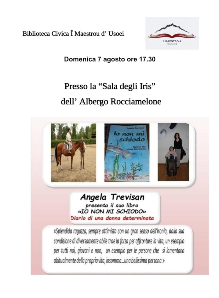 Alle ore 17:30, presso la "Sala degli Iris" dell'Albergo Rocciamelone, Angela Trevisan presenta il suo libro "Io non mi schiodo - Diario di una donna determinata".