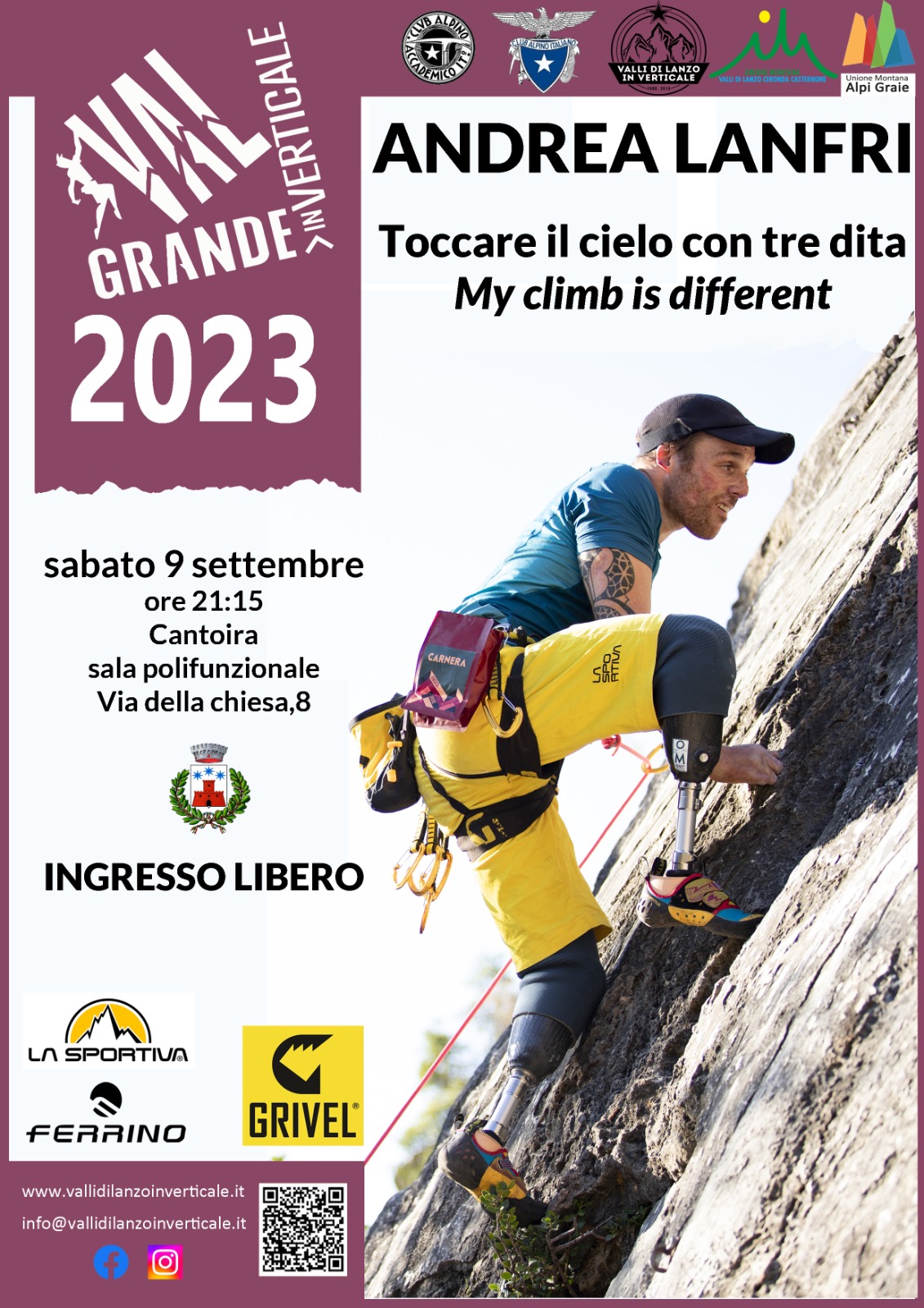 - Ore 21.15: confrerenza a cura dell’atleta Andrea Lanfri “Toccare il cielo con tre dita”. Le straordinarie avventure di questo alpinista che, nonostante due protesi alle gambe, ha raggiunto le cime più alte del Pianeta. Cantoira, Sala Polifunzionale, via Della Chiesa 8. Ingresso libero