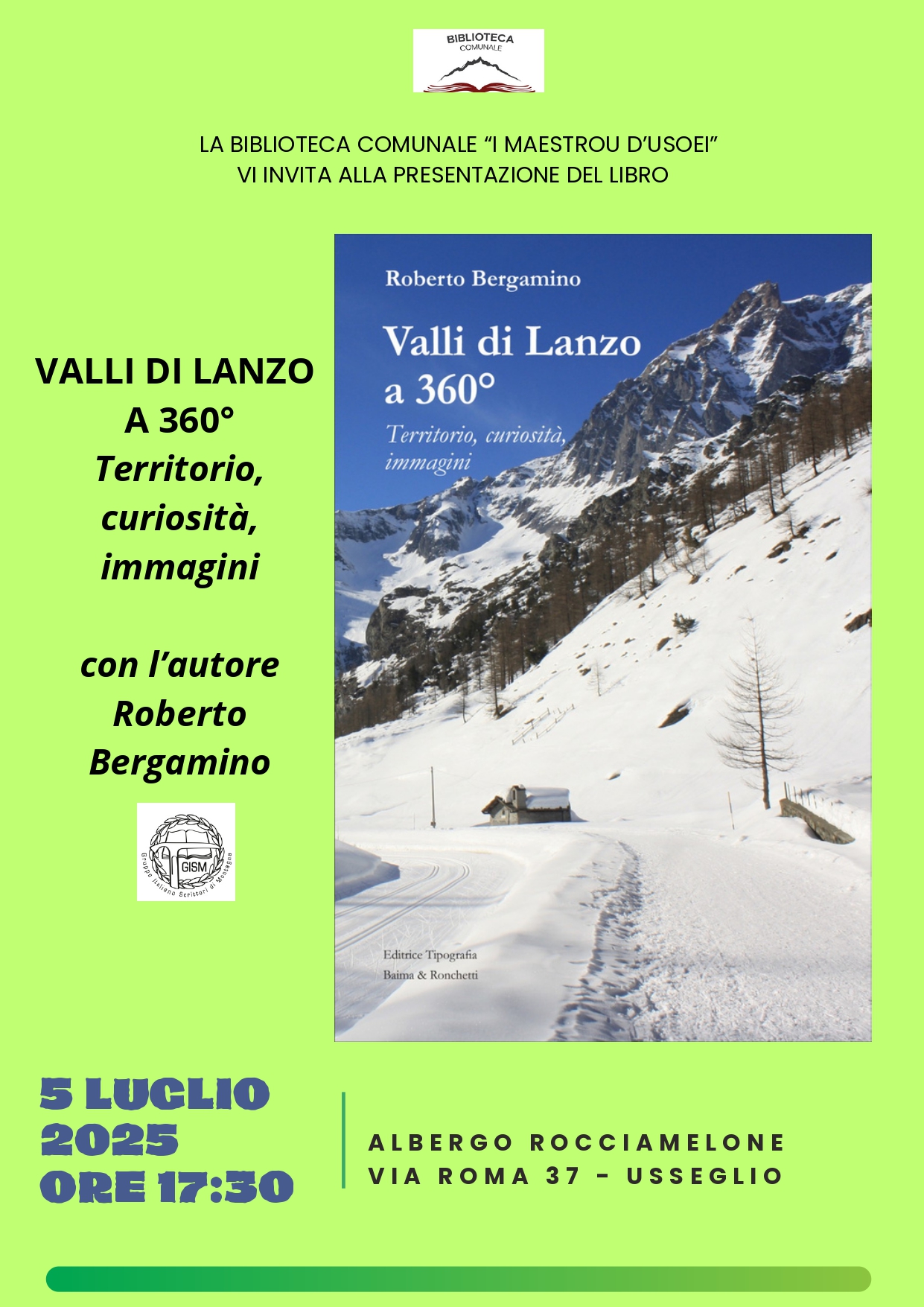 Presso l'albergo Rocciamelone di Usseglio, è previsto alle 17:30 l'incontro con l'autore Roberto Bergamino.