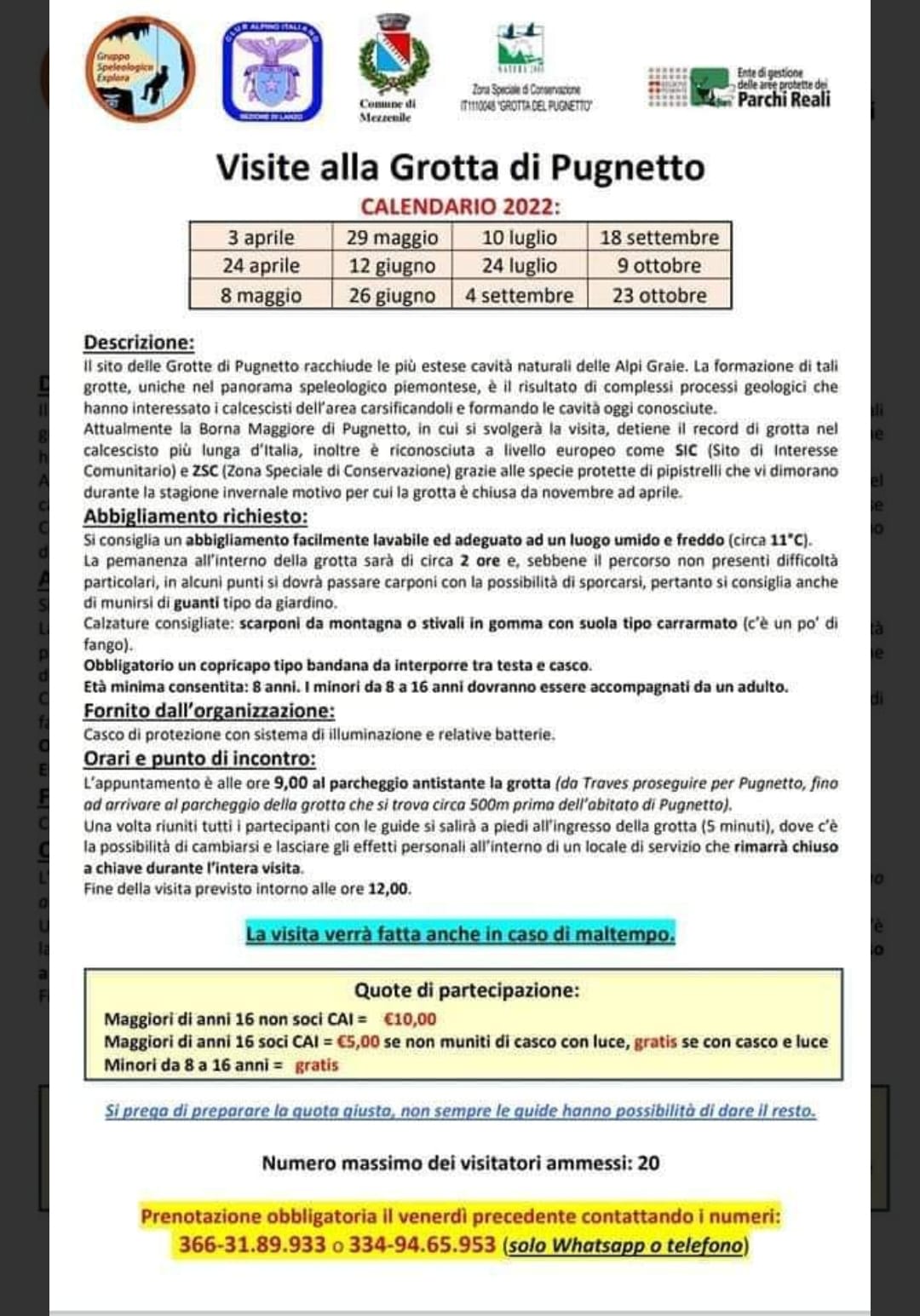 Maggiori di 16 anni soci CAI €5 se non provvisti di casco, gratis se muniti di casco e luce