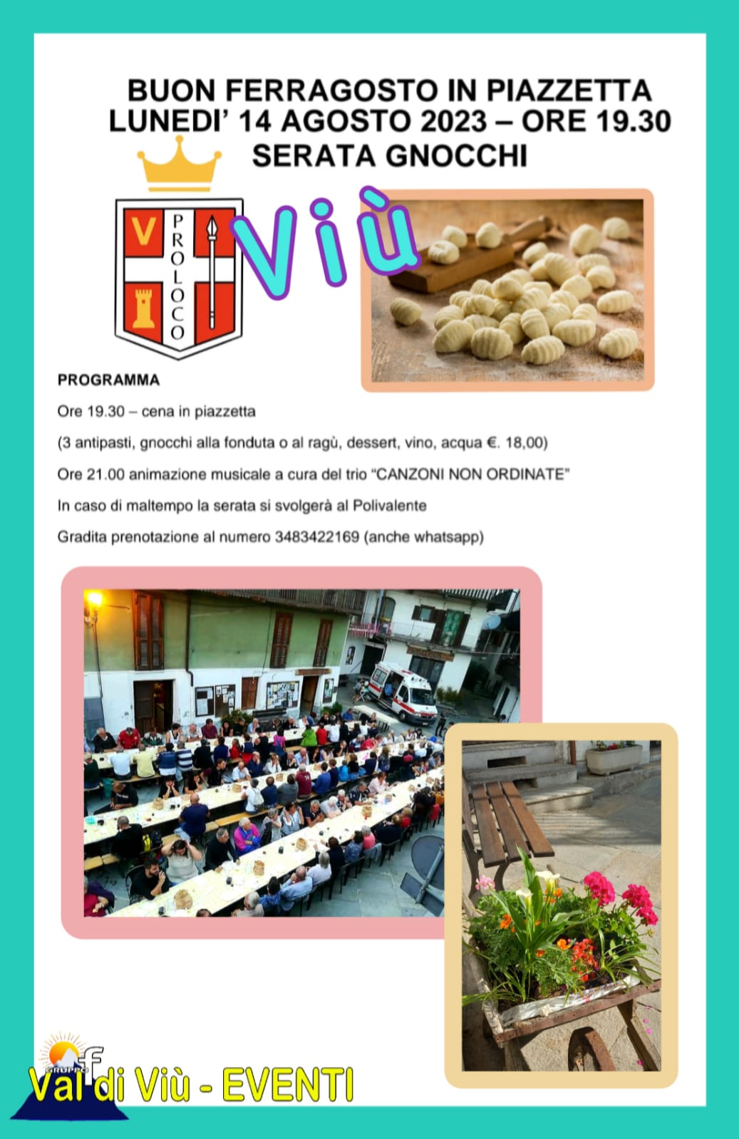 - Ore 19:30: Cena in piazzetta (tre antipasti, gnocchi alla fonduta o al ragù, dessert, vino e acqua € 18,00)