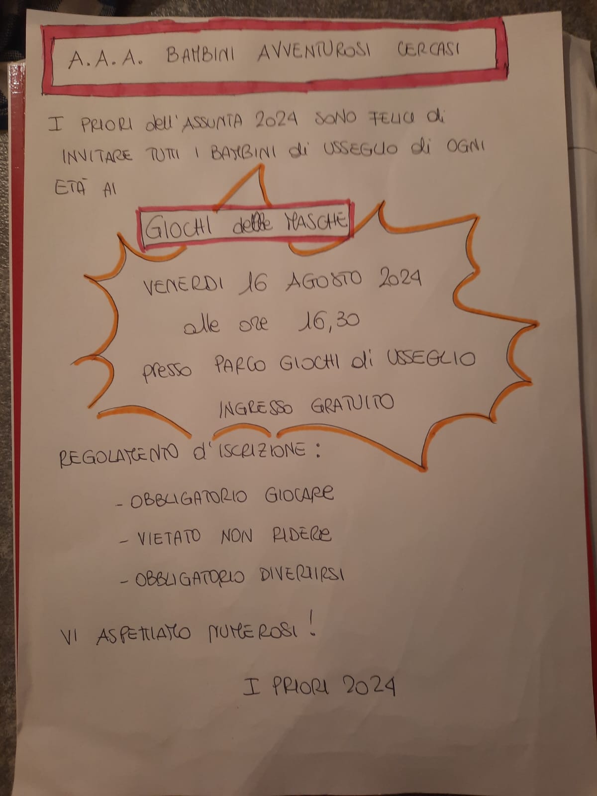 Venerdì 16 agosto alle ore 16,30 i priori dell'Assunta 2024 sono felici di invitare i bambini di Usseglio di tutte le età ai 'GIOCHI DELLE MASCHE' presso il Parco Giochi di Usseglio.