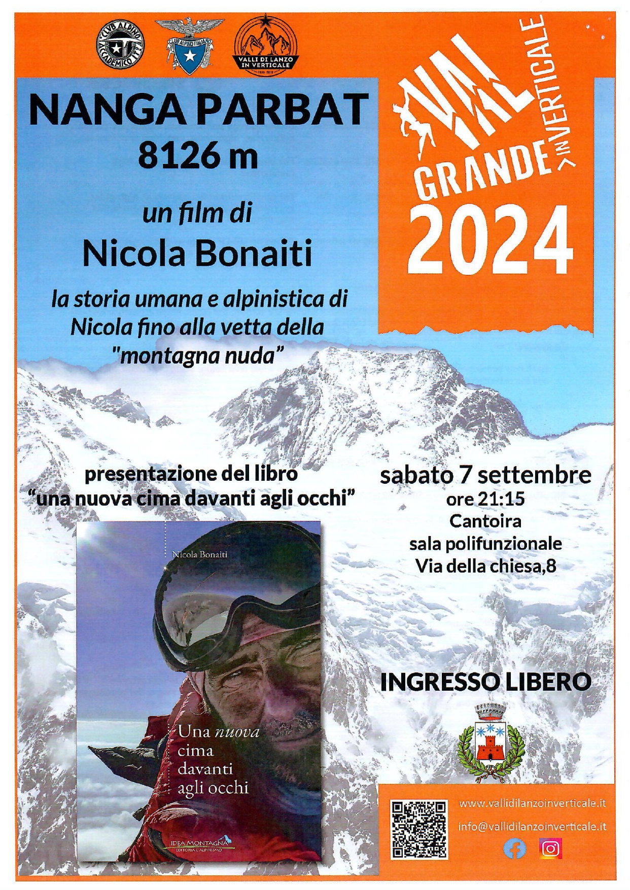 Sabato 14 settembre, presso la Sala Polifunzionale a Cantoira alle ore 21,15 avrà luogo la proiezione del film di Nicola Bonaiti 'NANGA PARBAT' a cura di Valli di Lanzo in Verticale.