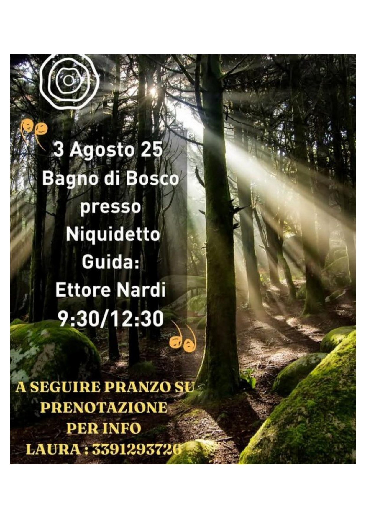 Vivi un’esperienza rigenerante immerso nella natura! Ti aspettiamo a Niquidetto per un Bagno di Bosco, una passeggiata guidata pensata per riconnettersi con se stessi attraverso i profumi, i suoni e la quiete del bosco.