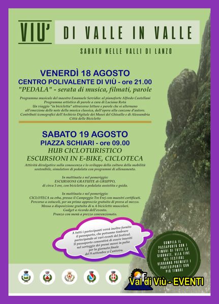 - ore 21 presso il Polivalente: "Pedala" - serata di musica, filmati, parole. Un viaggio "in bicicletta" attraverso letture e parole che si alternano all'emozione delle note della musica classica, dall'opera alla canzone d'autore. Contributi iconografici dell'Archivio Digitale dei Musei del Ghisallo e di Alessandria città delle biciclette. Musica a cura di Emanuele Servidio: al pianoforte Emanuele Castellani. Programma artistico a cura di Luciana Rota.