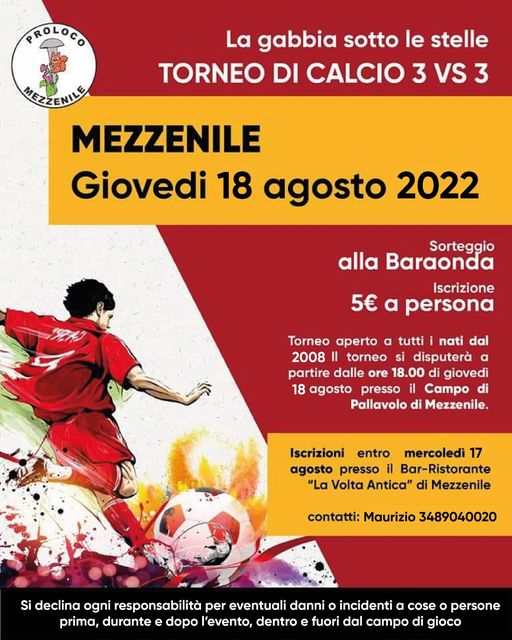 - ore 18.00 al campo sportivo ""La gabbia sotto le stelle"" - torneo di calcio 3 Vs 3