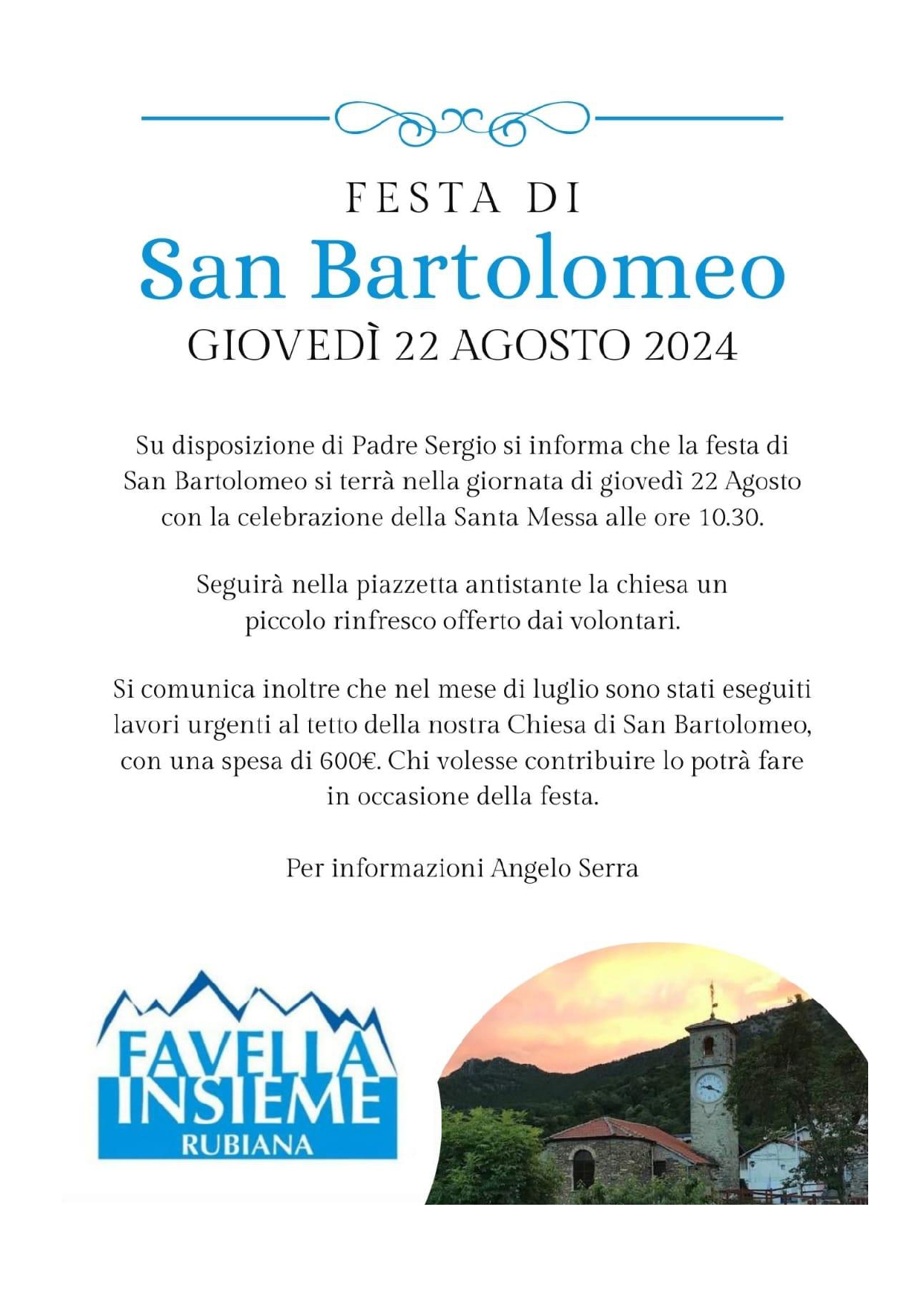 Giovedì 22 agosto avrà luogo la 'FESTA DI SAN BARTOLOMEO'