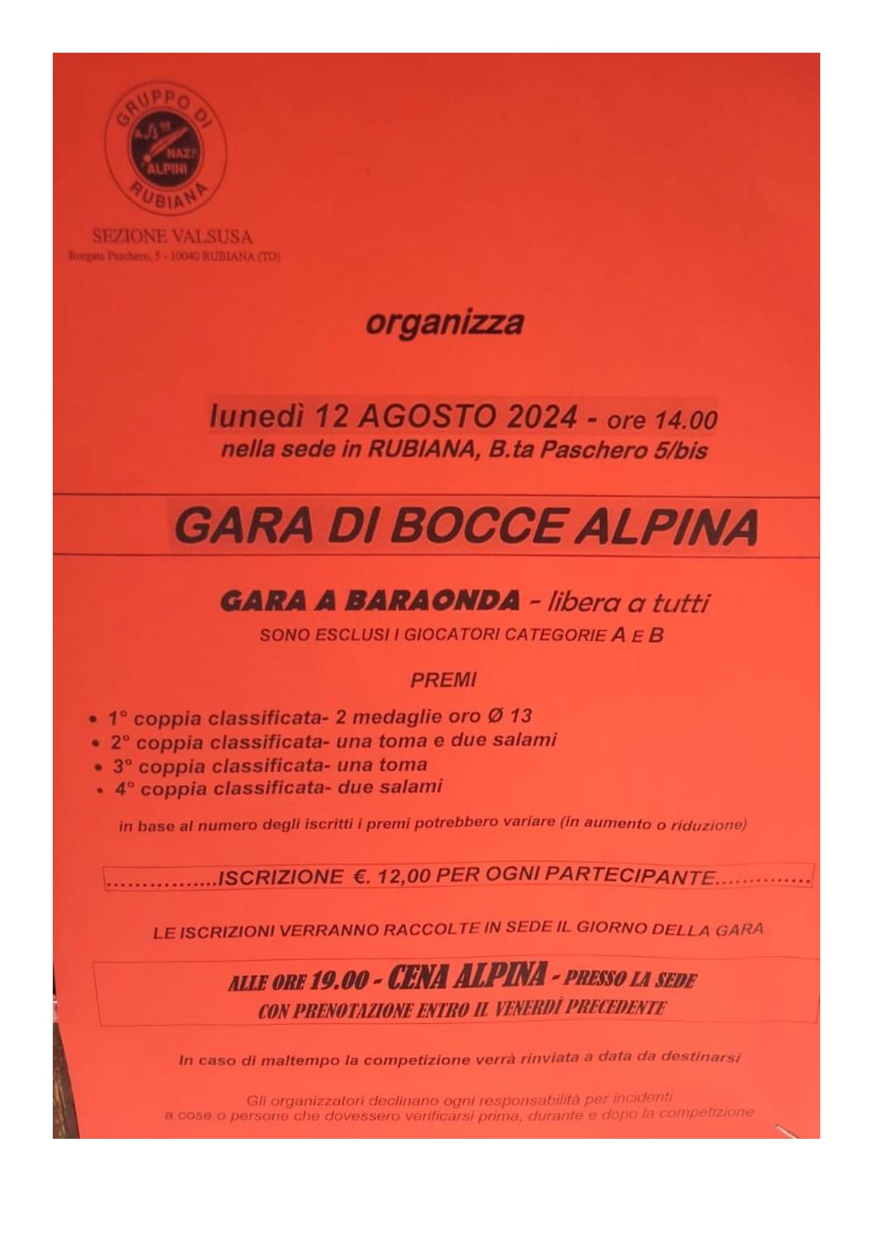 Lunedì 12 agosto il Gruppo Alpini di Rubiana organizza 'GARA A BARAONDA - libera a tutti' gara di bocce.