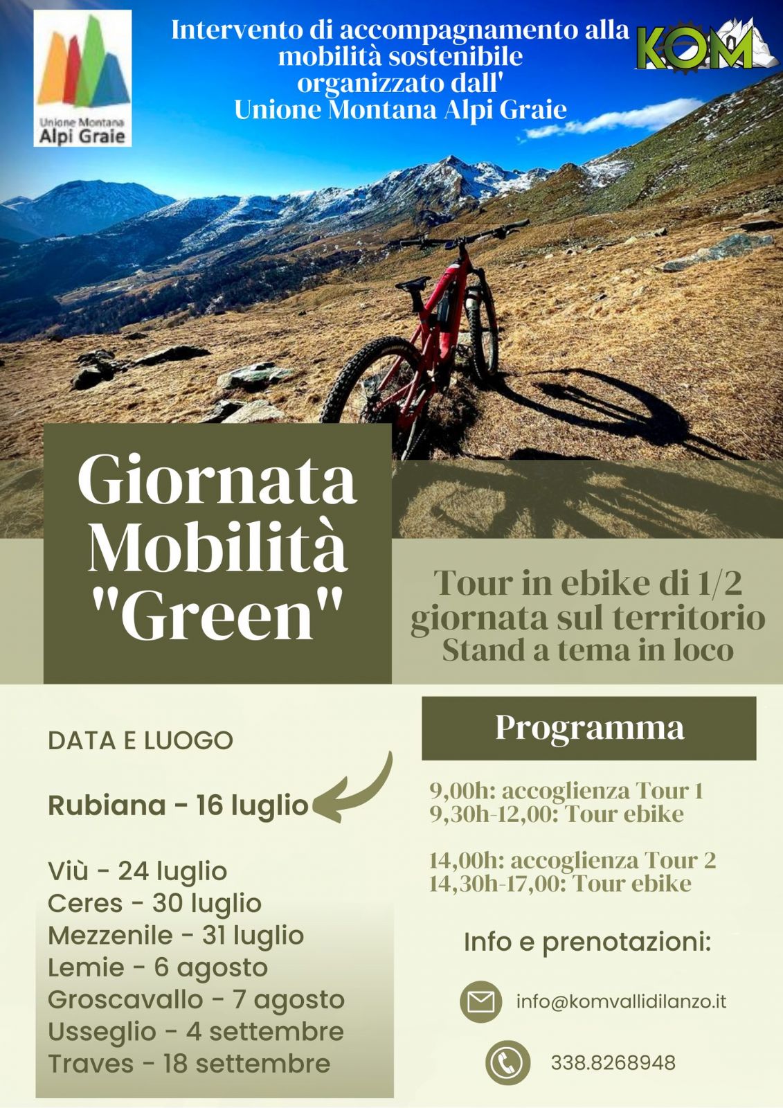 Si terranno due sessioni di tour, una al mattino ed una al pomeriggio, accompagnati da guide MTB certificate, che potranno essere prenotati presso KOM valli di Lanzo.