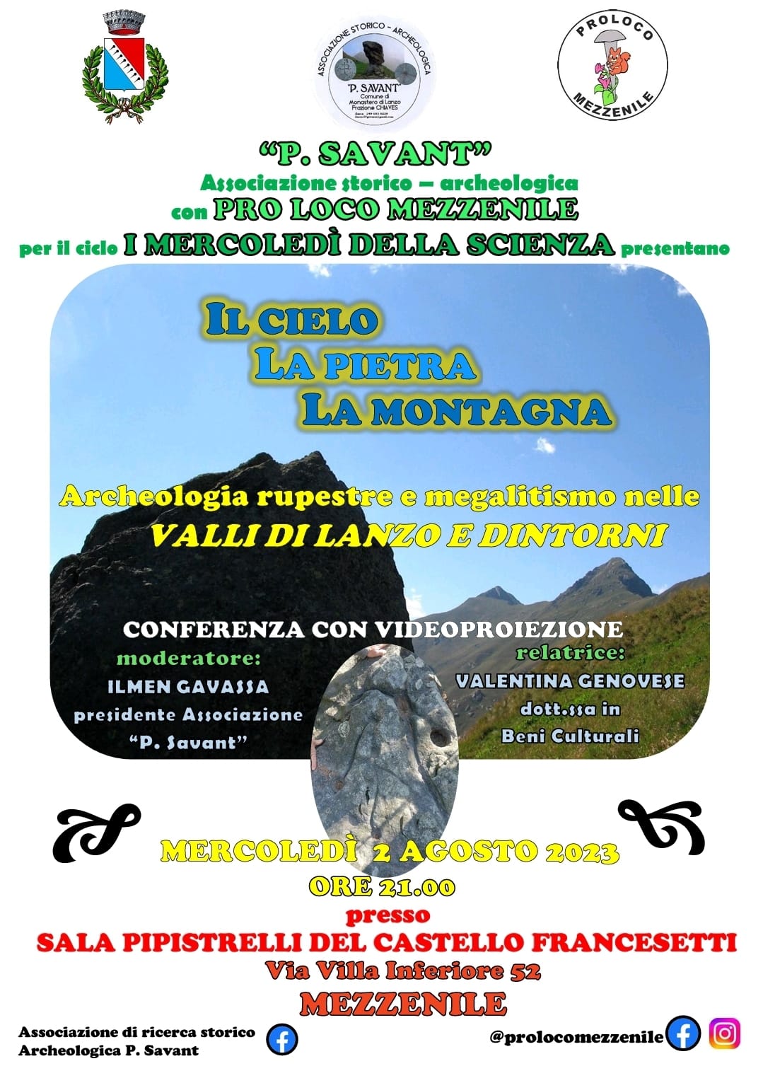 Archeologia rupestre e megalitismo nelle Valli di Lanzo e dintorni. Conferenza con videoproiezione con la relatrice valetina Genovese (Dott.ssa in beni colturali) e con il mediatore Ilmen Gavassa (Presidente dell'Associazione P.Savant)
